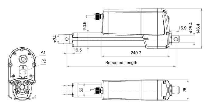 - 直线型电动推杆: 马达设置与驱动轴呈同一直线排列。因此,它的缩回长度较长。它们通常由一组行星齿轮传动配件驱动,很适合应用于较狭窄或小尺寸的安装空间。然而,操作时通常会有较大的噪音。